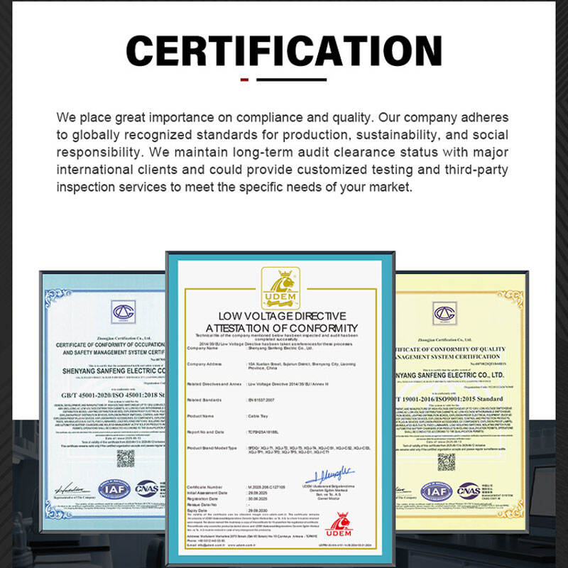 Shenyang Sanfeng Electric Co., Ltd. is an enterprise specializing in the design, research and development, manufacturing and sales of industrial product. The company's site area is 50,000 square meters and the annual production capacity is 50 million dollar. The company has advanced computer-aided design system and advanced CNC processing equipment. The company and products have passed the quality system certification, environmental management system certification and occupational health and safety management system certification, as well as the national 3C certification and national patent certification.Our major cable tray products are perforated cable tray, cable trunking, cable ladder, floor cable tray and drawer cable tray with different surface finishing such as stainless steel, pre-galvanized, powder coated and hot dip galvanized.